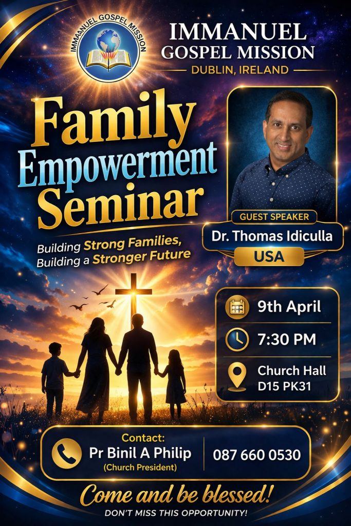 Join us for a powerful Family Empowerment Seminar hosted by Immanuel Gospel Mission, Dublin, Ireland. Guest speaker Dr. Thomas Idiculla (USA),